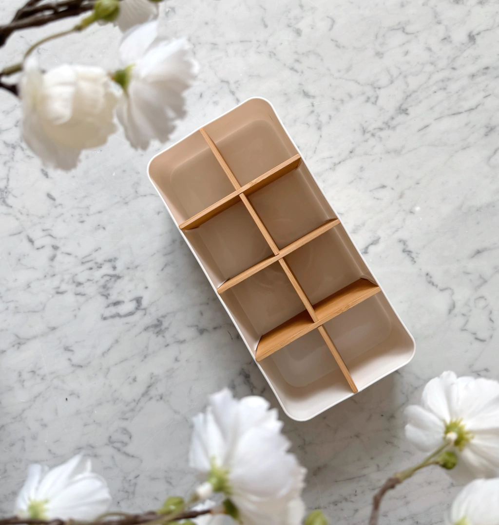 El Organizador Hestia es la solución perfecta para tu baño. Fabricado en plástico blanco resistente con detalles en bamboo natural, cuenta con 8 divisiones para maximizar el orden de tus objetos personales. Sus medidas compactas (27x12,8x7,9 cm) lo hacen ideal para espacios reducidos. Además, su diseño moderno y funcional aporta calidez y practicidad a tu ambiente, ayudándote a mantener todo a mano y organizado.