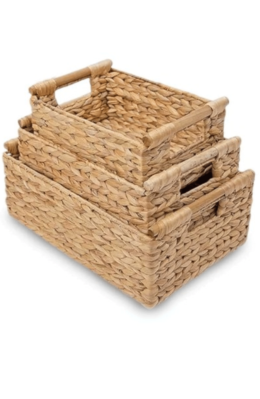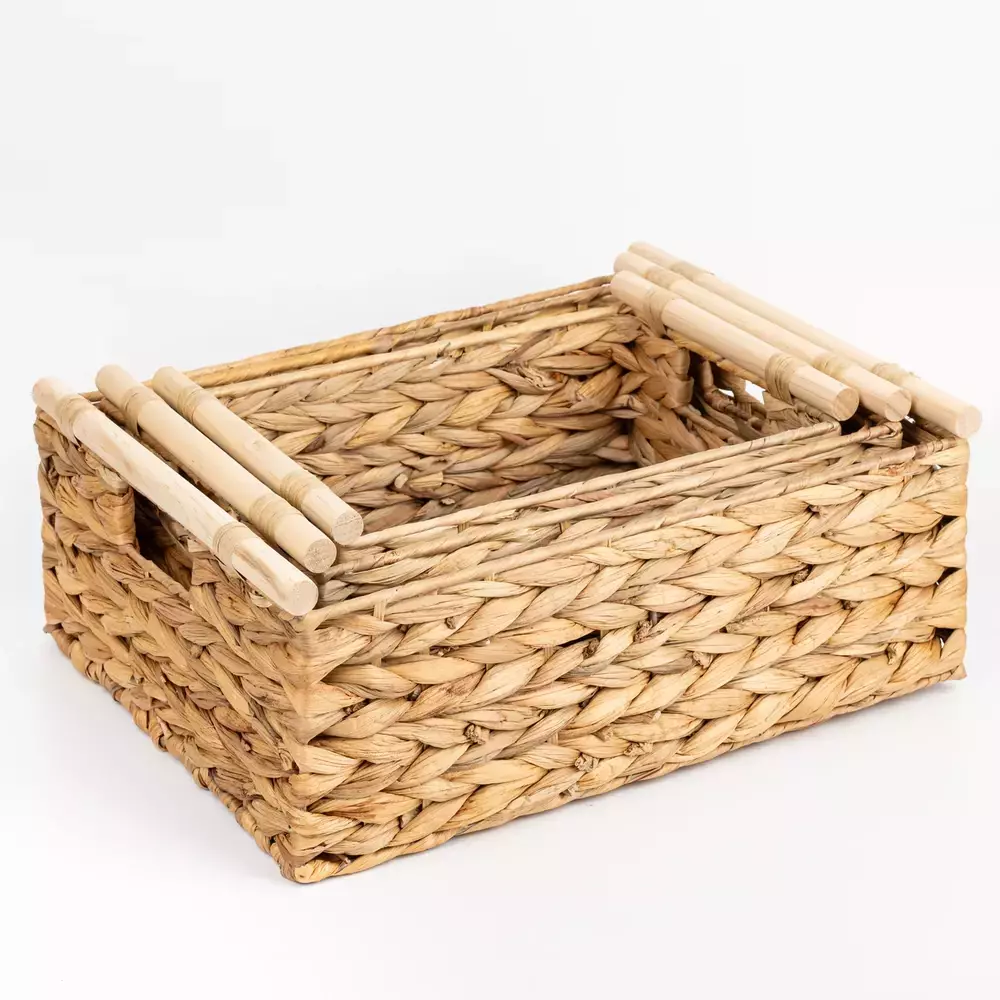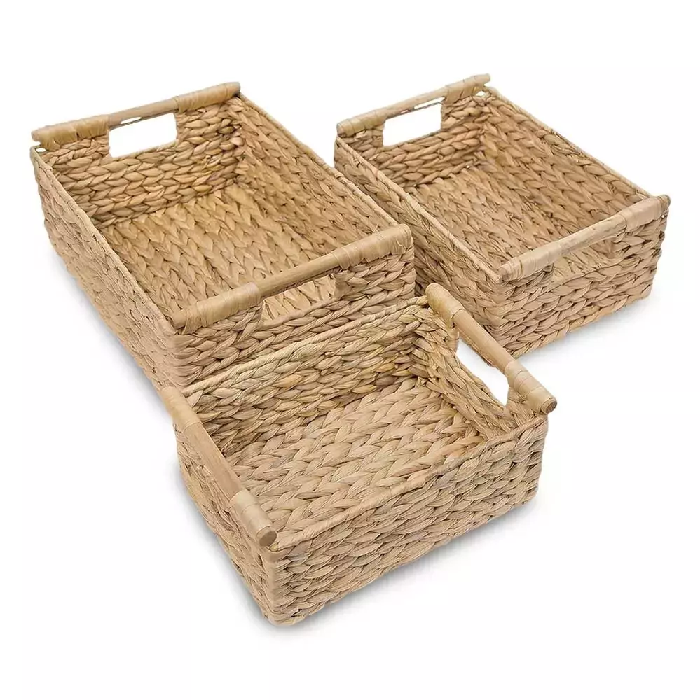 Optimizá la organización de tu hogar con el Set x3 Canastos Esterelle. Fabricados en gourd grass y con asas de madera, estos canastos rectangulares vienen en tres tamaños: 40,6x31,7x16cm, 35,5x26,6x15,2cm y 30,5x21,6x14cm. Ideales para almacenar objetos, ropa o accesorios, combinan practicidad y estilo natural en cualquier ambiente de la casa.