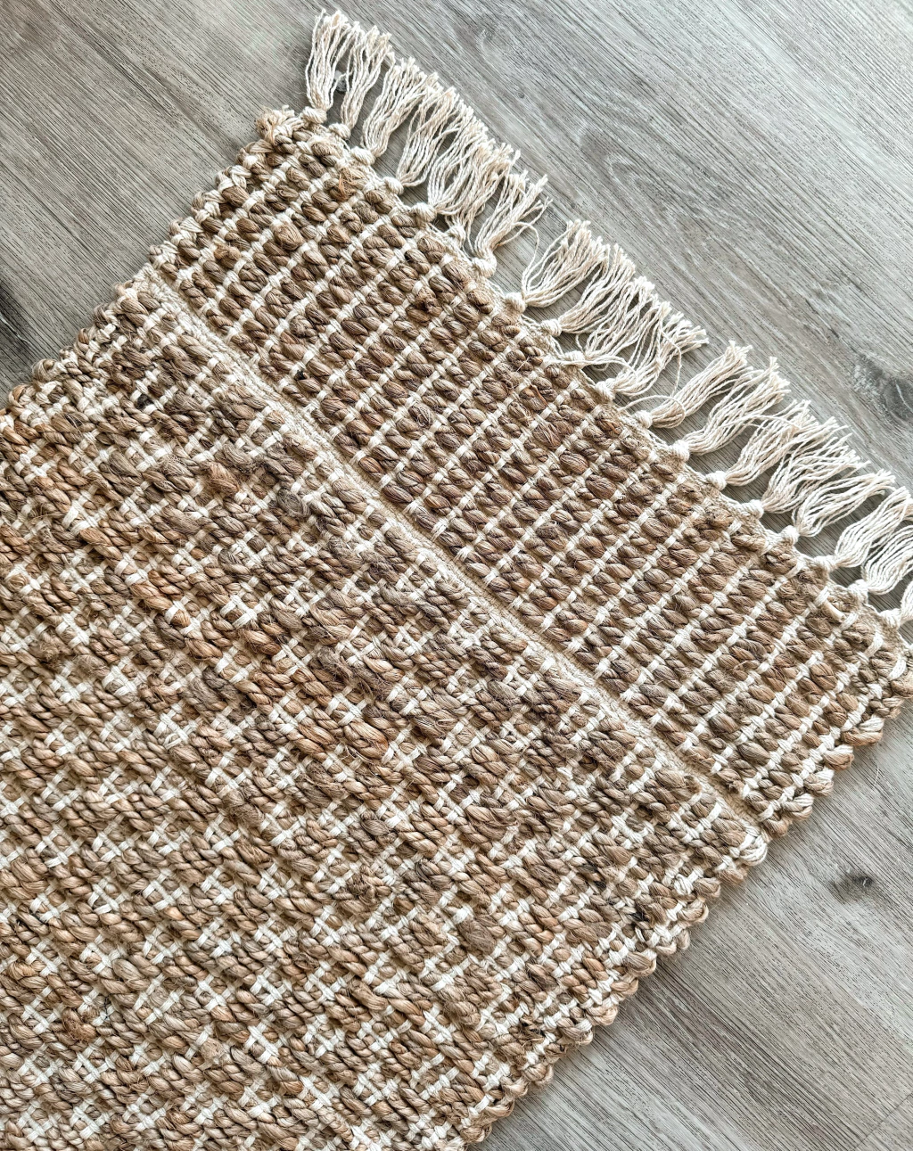 Descubrí la Alfombra Kanya 50x80cm, confeccionada en yute tramado con algodón e importada de la India. Su diseño de rombos, líneas y rectángulos con flecos aporta calidez y estilo a cualquier ambiente. Medida ideal para pasillos, baños o entradas. Una opción natural y elegante para renovar tus espacios, combinando calidad artesanal y tendencia en decoración.