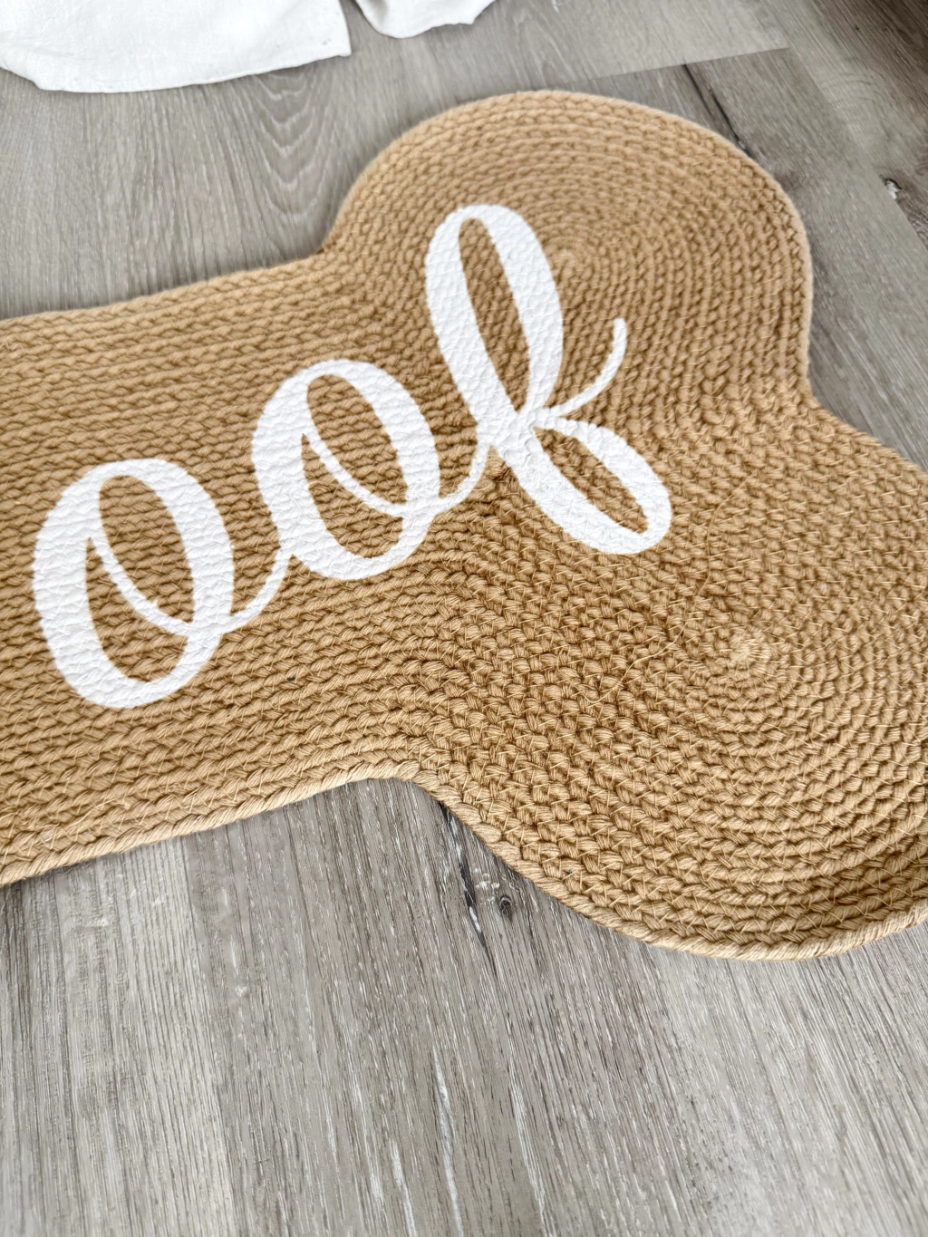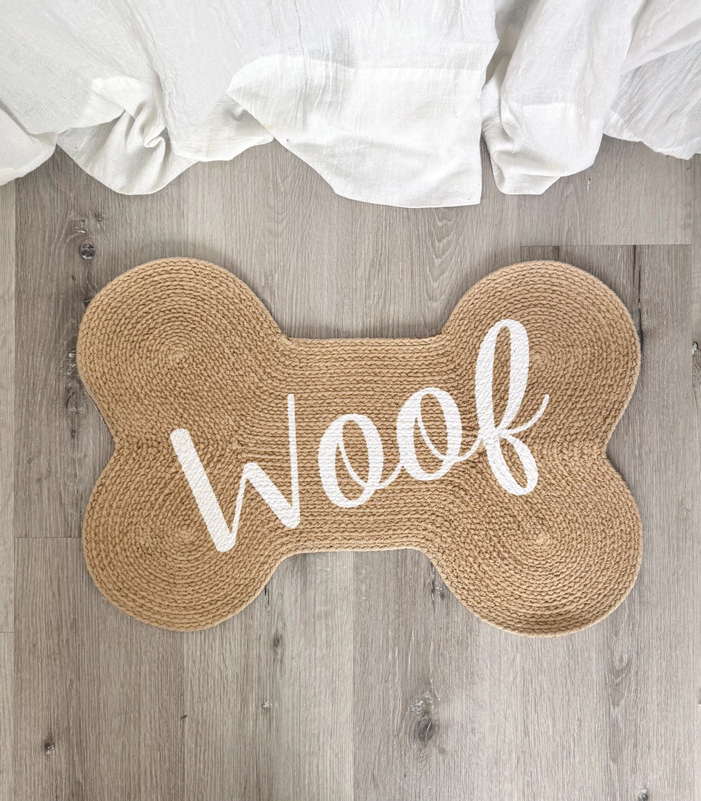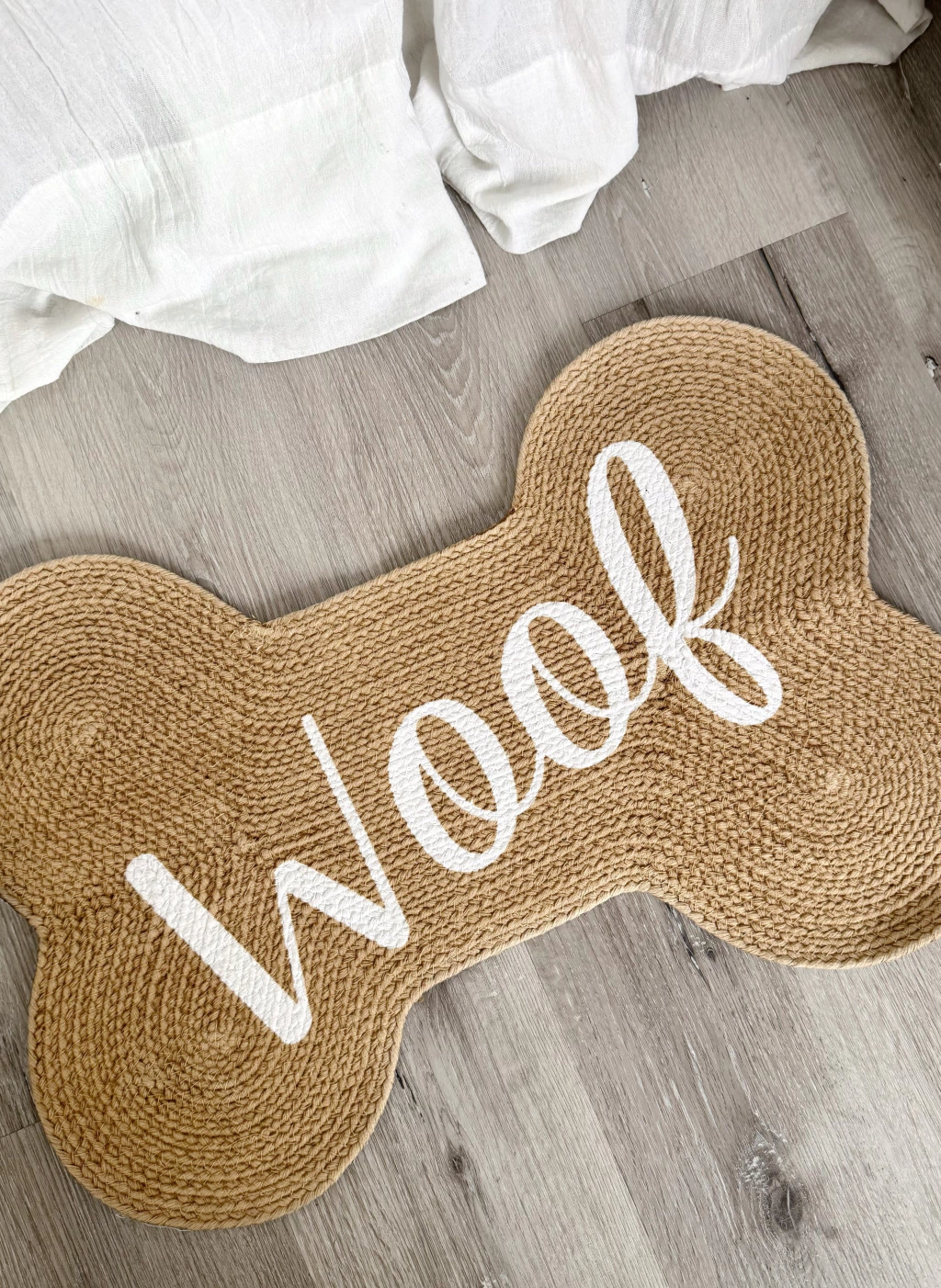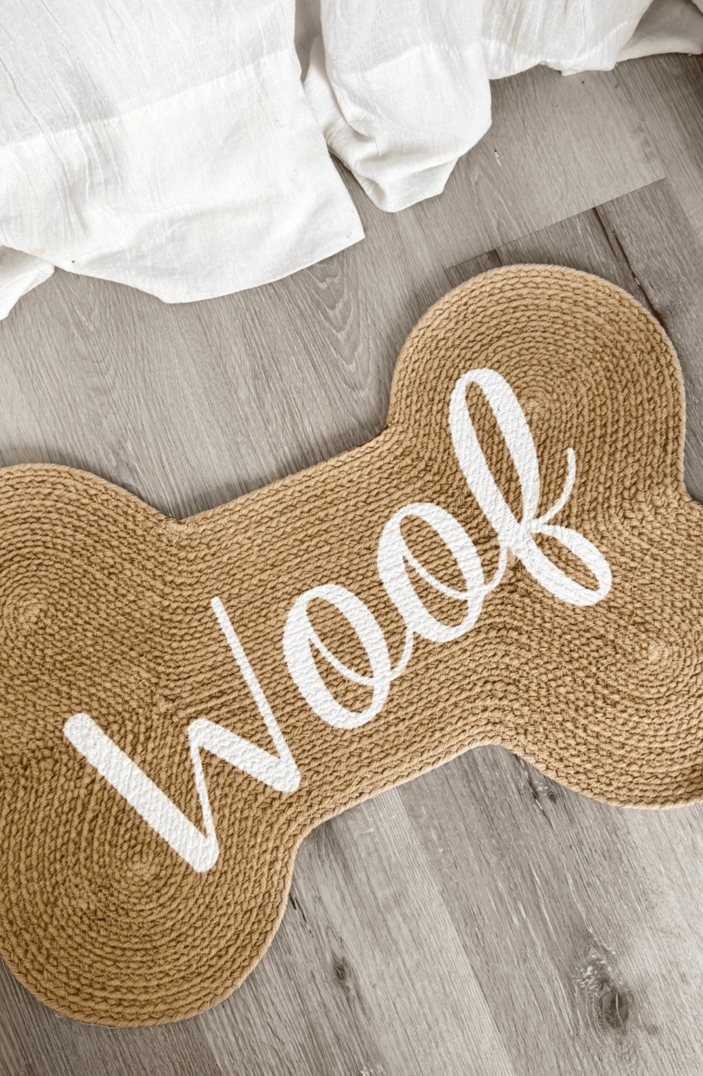 Alfombra Huesito Beige 40x60cm, fabricada en algodón tramado y con forma de hueso, ideal para sumar estilo y comodidad a los espacios de tu mascota. Importada de la India, su diseño beige incluye la inscripción interna "woof". Práctica y decorativa, es perfecta para colocar junto al comedero o en zonas de descanso, ofreciendo suavidad y fácil mantenimiento.