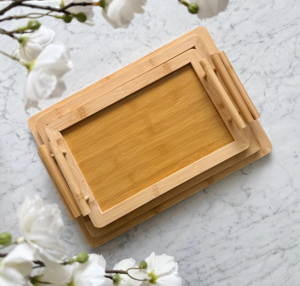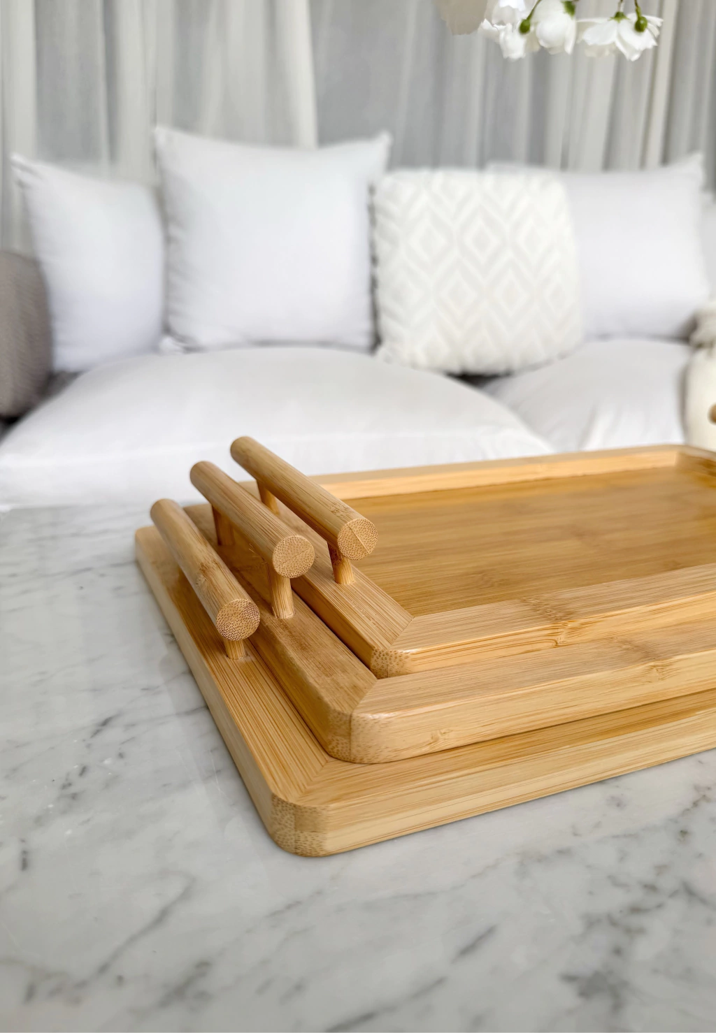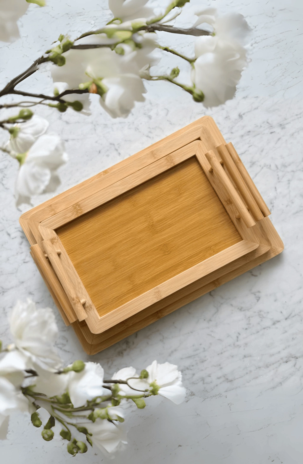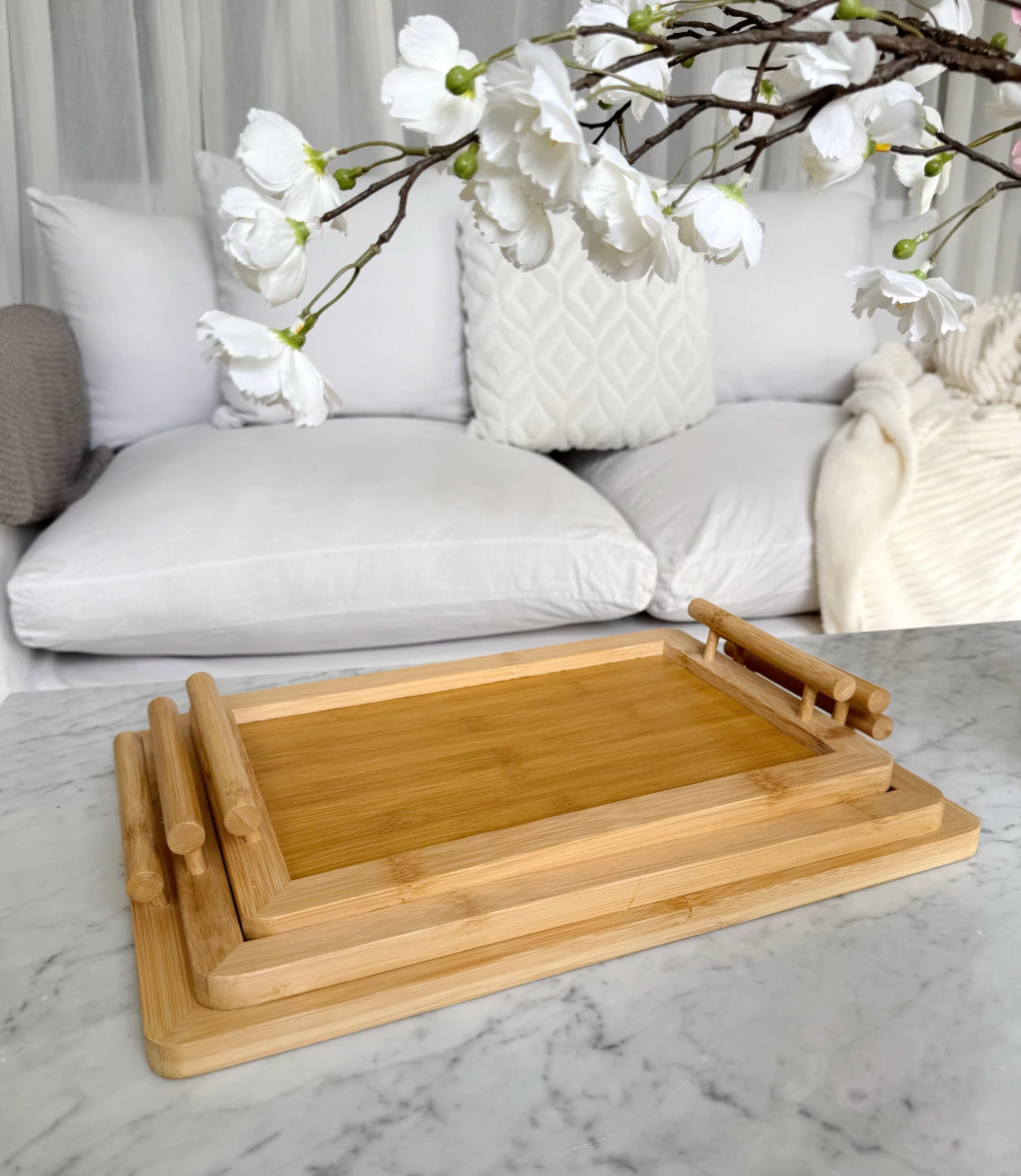 Descubrí el Set x3 bandejas Omaha, elaborado en bamboo natural. Incluye tres tamaños: 33x22 cm, 37x26 cm y 41x29 cm, ideales para servir, organizar o decorar tus espacios. Su diseño moderno y sustentable aporta calidez y estilo a cualquier ambiente. Perfectas para el uso diario o eventos, las bandejas Omaha combinan funcionalidad y elegancia en tu hogar.