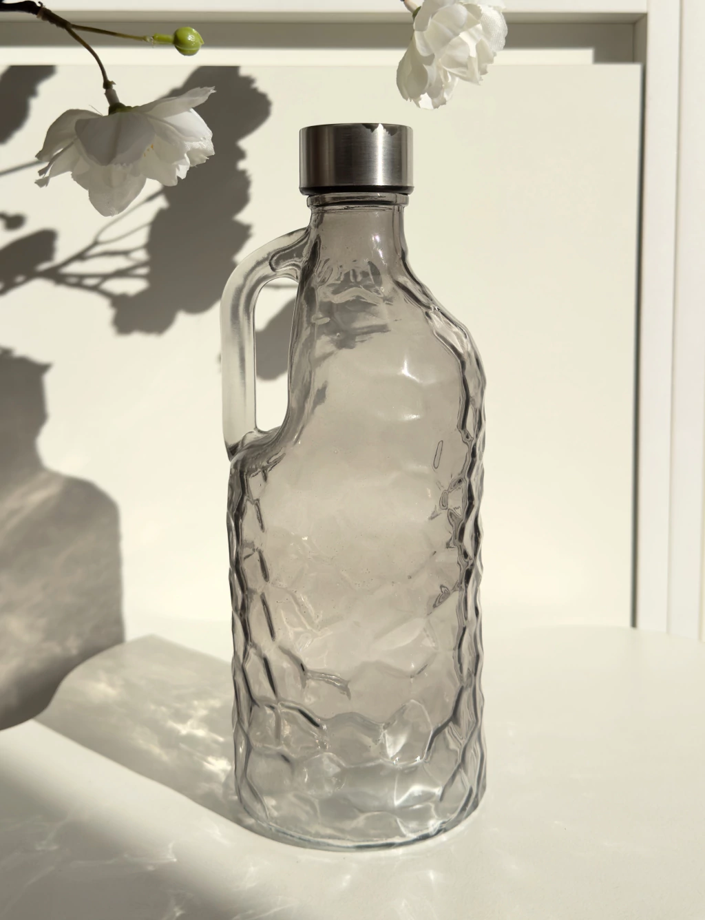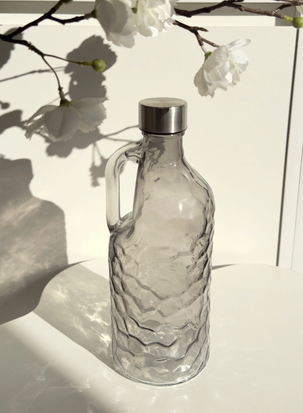 Botella Yiader Gris Sumá diseño y practicidad a tus bebidas con la botella de pentágonos irregulares redonda en color gris. Fabricada en vidrio resistente, cuenta con asa para fácil traslado y tapón de acero para mayor seguridad. Sus medidas son 9,5x9,5x25,5 cm y capacidad de 1000ml. Ideal para agua, jugos o infusiones, aporta un toque moderno a tu mesa o cocina.