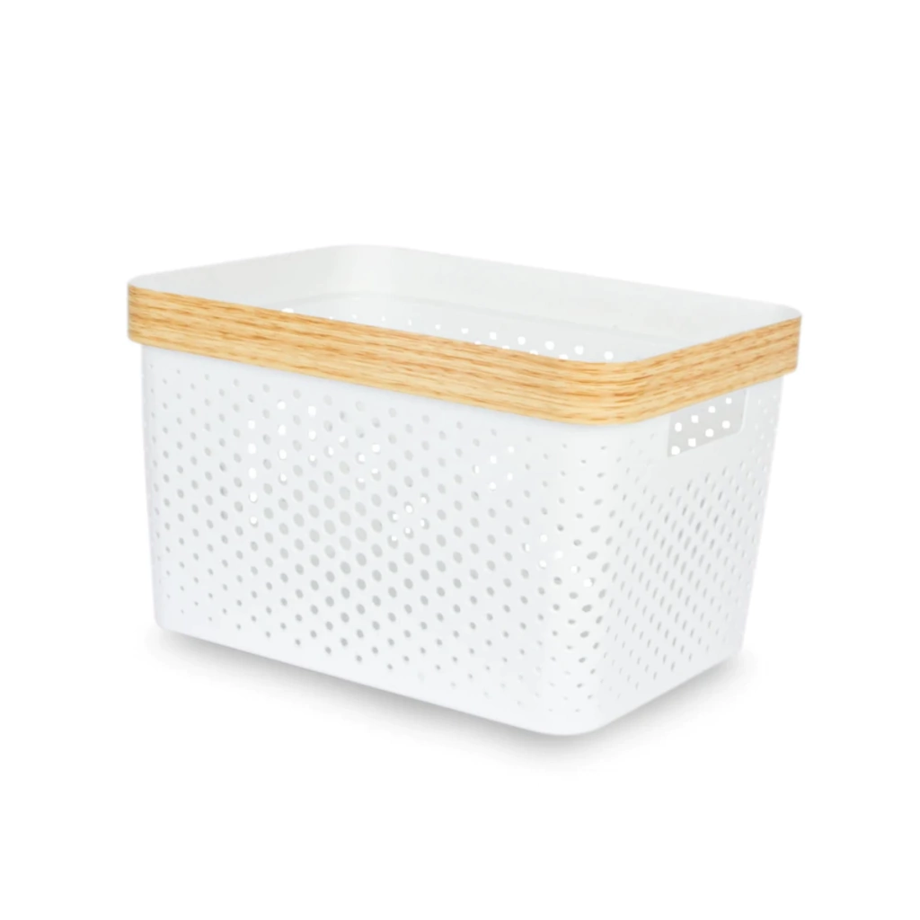Organizá tu hogar con el Canasto Agata de 17 litros. Su diseño moderno, con puntos y borde de bambú, combina funcionalidad y estilo para cualquier ambiente. Medidas: 36x27x24 cm. Ideal para almacenar ropa, juguetes o productos de limpieza, este canasto plástico es resistente, liviano y fácil de limpiar. Perfecto para mantener tus espacios ordenados con un toque natural y elegante.