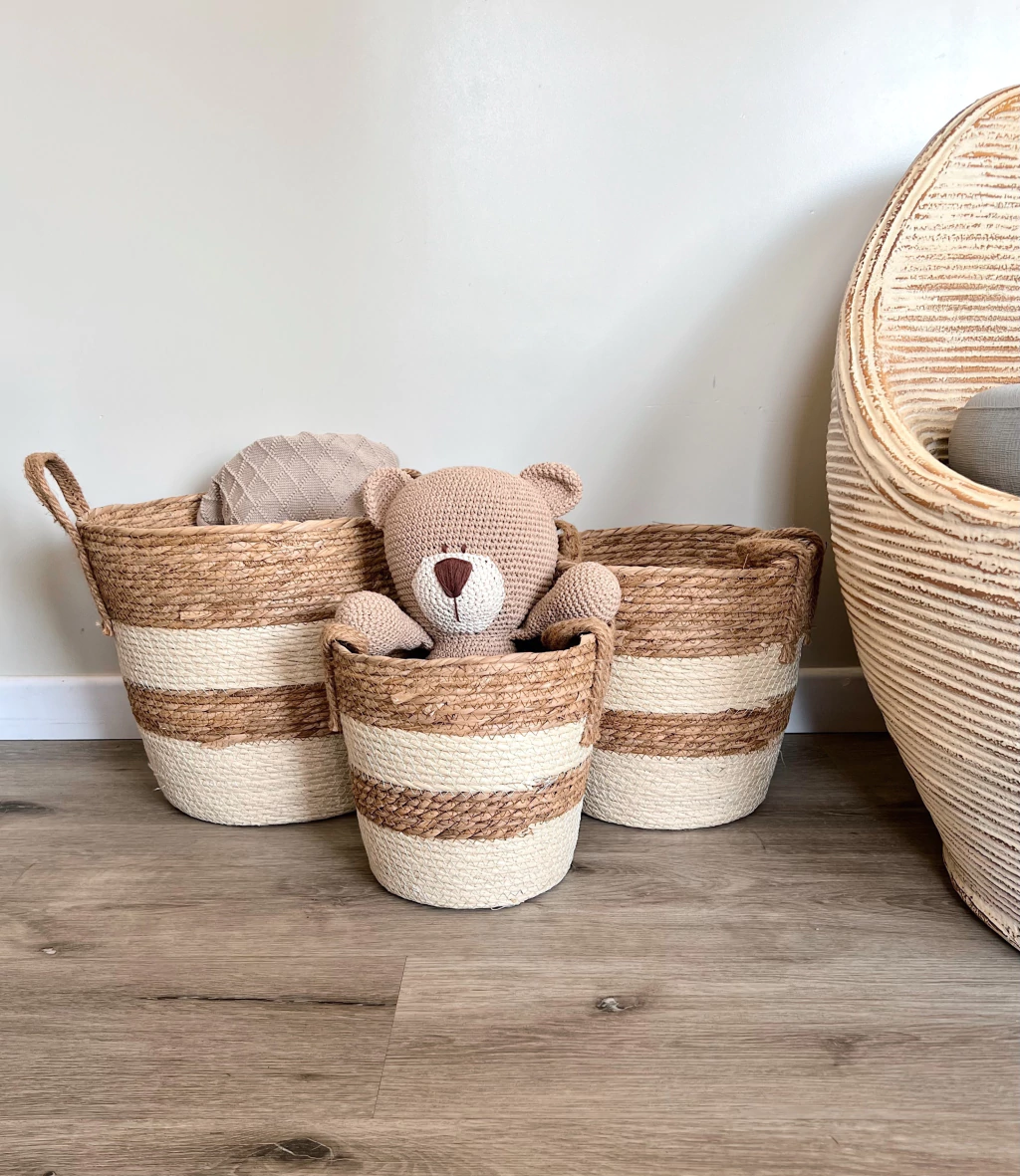 Los Canastos de seagrass con hoja de maíz rayados Belinda son la opción ideal para organizar y decorar tu hogar. Disponibles en tres tamaños (L 32x32x32 cm, M 27x27x27 cm, S 23x23x23 cm), combinan materiales naturales y diseño artesanal. Perfectos para almacenar textiles, juguetes o plantas, aportan calidez y estilo a cualquier espacio, integrando funcionalidad y tendencia sustentable.