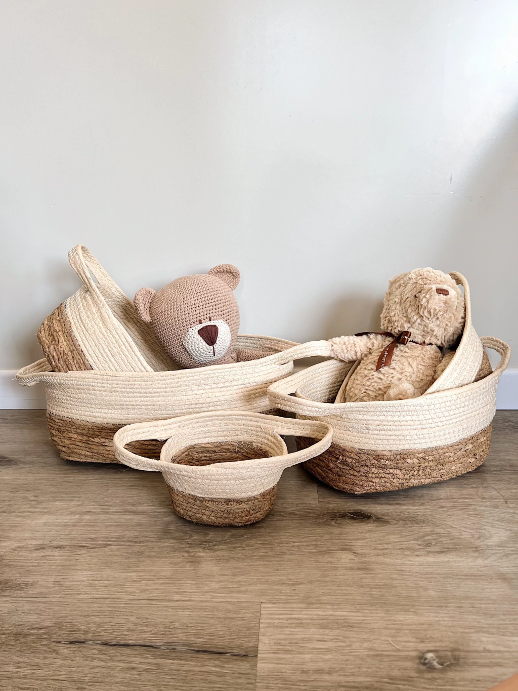 Descubrí el Set de Canastos organizadores Moorea, confeccionados en fibras naturales con borde color crema. Disponibles en tres opciones: Set x5 (todas las medidas), Set x3 (S-M-L) y Set x2 (XL-XXL). Son ideales para organizar cualquier ambiente del hogar con estilo y calidez. Medidas: XXL 41x25x15, XL 33x23x14, L 28x20x13, M 22x17x11, S 17x13x10.