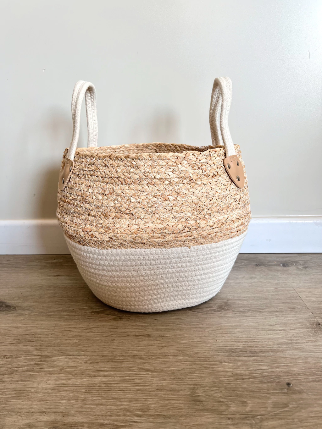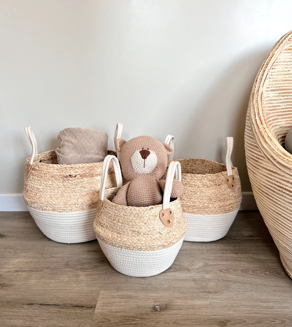 Organizá tus espacios con estilo usando los Canastos Lumier. Realizados en fibras naturales y diseño bi color, cuentan con prácticas asas de cuero que facilitan su traslado. Ideales para guardar objetos y decorar cualquier ambiente de tu hogar. Disponibles en tres tamaños: Grande (33x28x36 cm), Mediano (27x22x26 cm) y Chico (23x17x23 cm). Aportá calidez y funcionalidad a tu día a día.