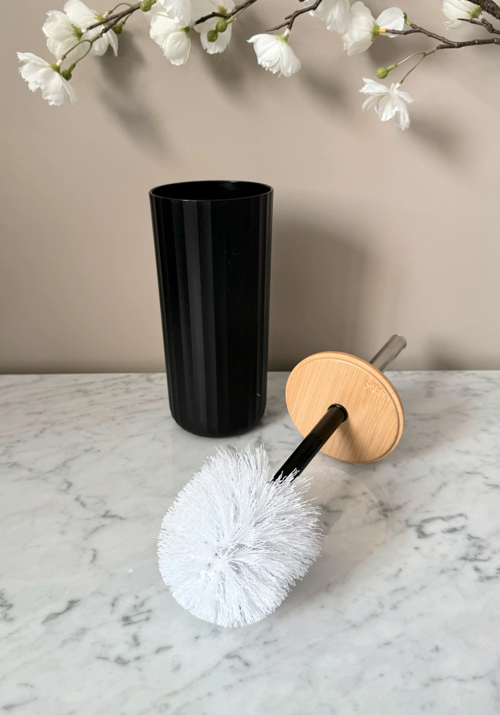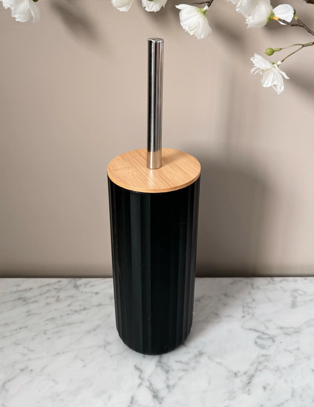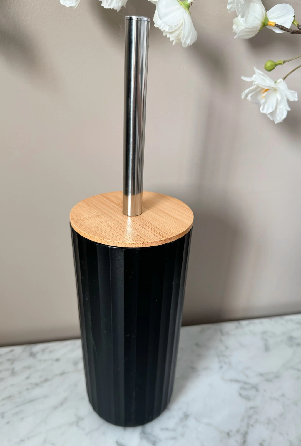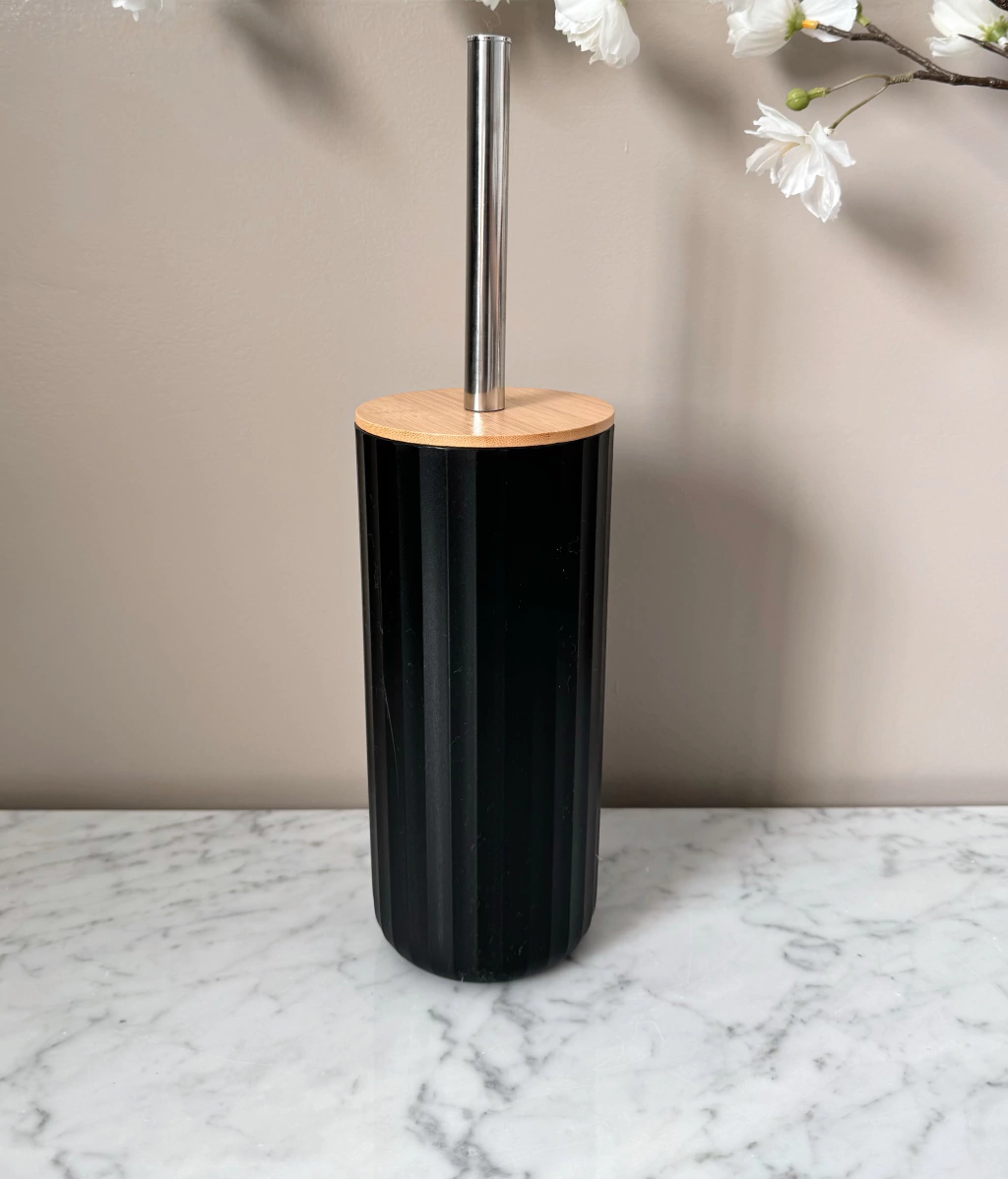El Cepillo de baño Berolden Negro destaca por su diseño elegante y funcionalidad. Fabricado en plástico resistente con rayas negras, incorpora una tapa de bambú y detalles metálicos, lo que aporta un toque moderno y natural a tu baño. Su estructura facilita la limpieza eficiente, mientras que la tapa ayuda a mantener la higiene y el orden. Ideal para complementar ambientes contemporáneos, combinando practicidad y estilo en cada detalle.
