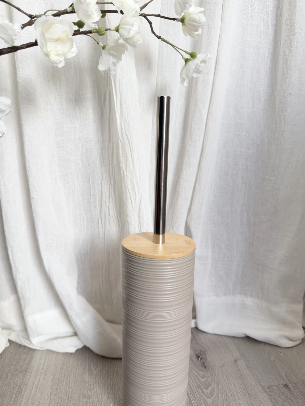 Cepillo de baño Leslie Beige, diseñado para brindar limpieza eficiente y estilo a tu baño. Su cuerpo de plástico rayado en color beige se complementa con una tapa de bamboo y un mango de plástico metalizado, fusionando funcionalidad y elegancia. Medidas: 24,5x9 cm. Producto importado de China, ideal para quienes buscan calidad y diseño en cada detalle de su hogar.