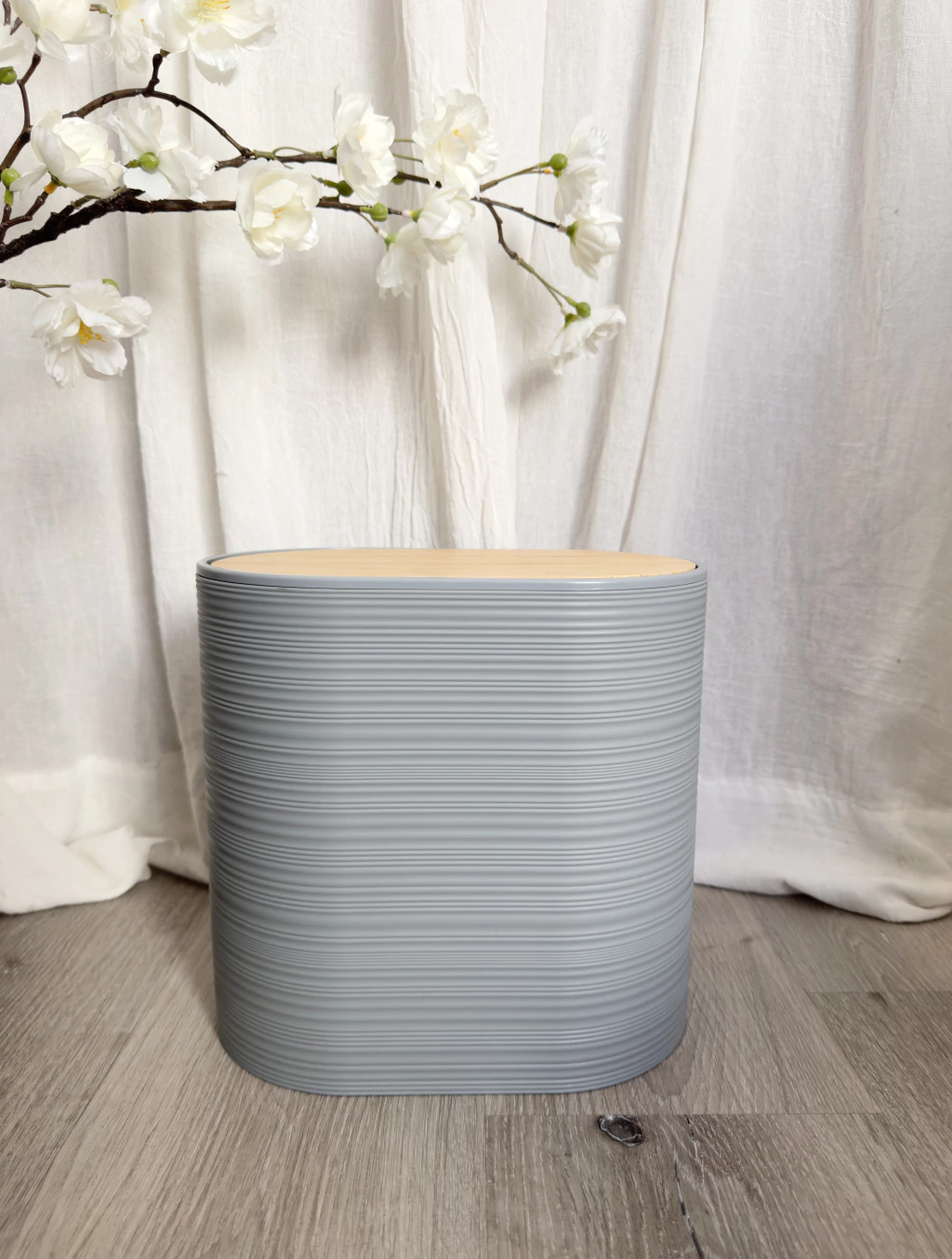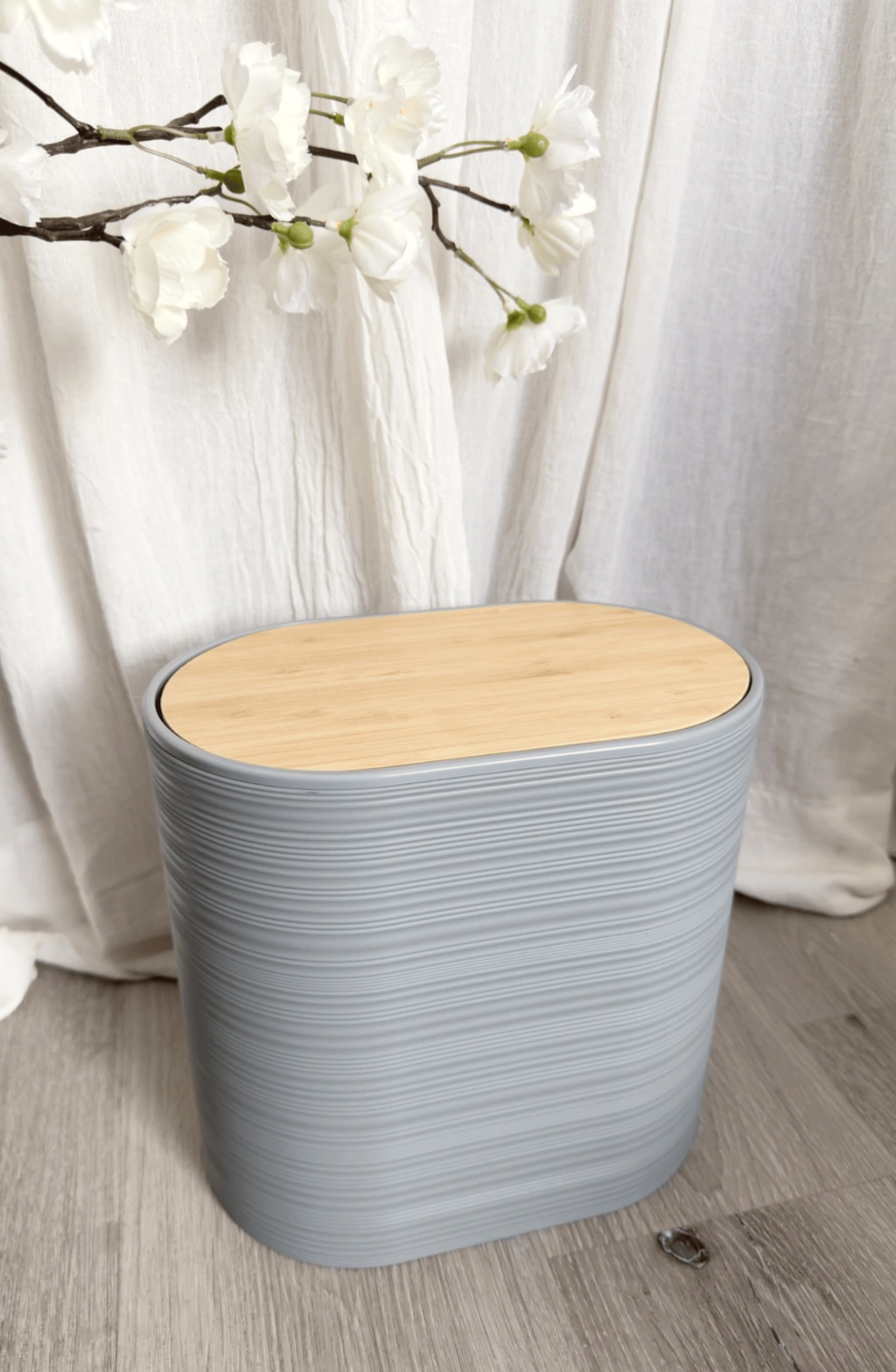 Cesto de basura Leslie Gris, ideal para mantener tus espacios limpios y organizados. Fabricado en plástico resistente, presenta un diseño oval rayado y una elegante tapa vaivén de bamboo. Su tamaño compacto (25,5x16x24cm) y capacidad de 9 litros lo hacen perfecto para baños, cocinas u oficinas. Importado de China, combina practicidad y estilo en cada ambiente.