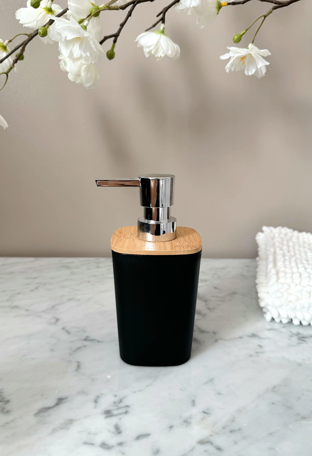 Optimizá tu baño o cocina con el Dispenser Balmed Negro. Su diseño cuadrado, en negro liso, incluye tapa de bamboo y mango cromado de plástico, brindando elegancia y practicidad. Medidas: 7x7x16 cm, ideal para cualquier espacio. Fácil de recargar y limpiar, este dispenser para jabón líquido es la opción perfecta para sumar un toque moderno y funcional a tu hogar.
