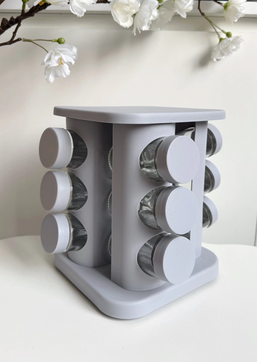 Organizá tus especias con el Especiero cuadrado de plástico giratorio de 12 frascos de vidrio gris. Su diseño compacto y giratorio facilita el acceso a cada condimento, optimizando espacio en tu cocina. Los frascos de vidrio transparente permiten identificar el contenido fácilmente. Ideal para mantener tus especias ordenadas y al alcance de la mano, aporta funcionalidad y elegancia al ambiente culinario.