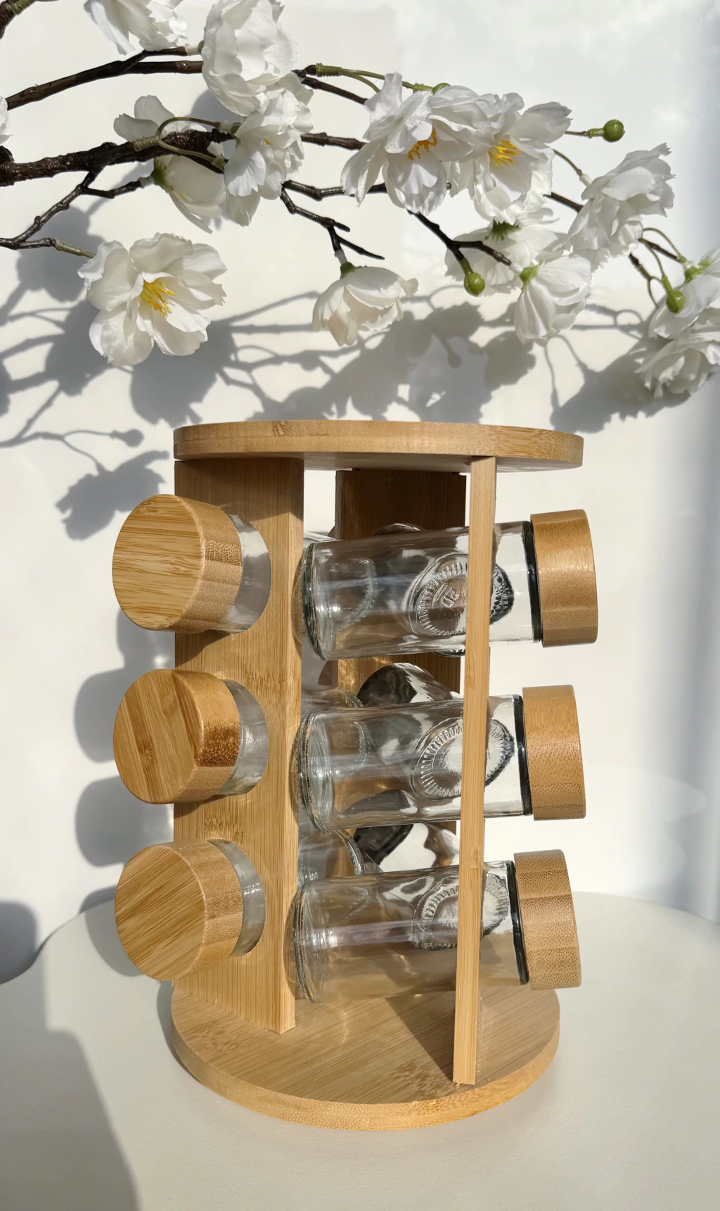 Especiero Rosama x9 frascos, la solución perfecta para organizar tus especias con estilo y practicidad. Este especiero giratorio redondo está fabricado en madera, incluye 9 frascos de vidrio de 100ml con tapa de bamboo, y mide 15x15x23cm. Ideal para mantener tus condimentos frescos y al alcance en la cocina. Elegancia, funcionalidad y diseño sustentable en un solo producto.