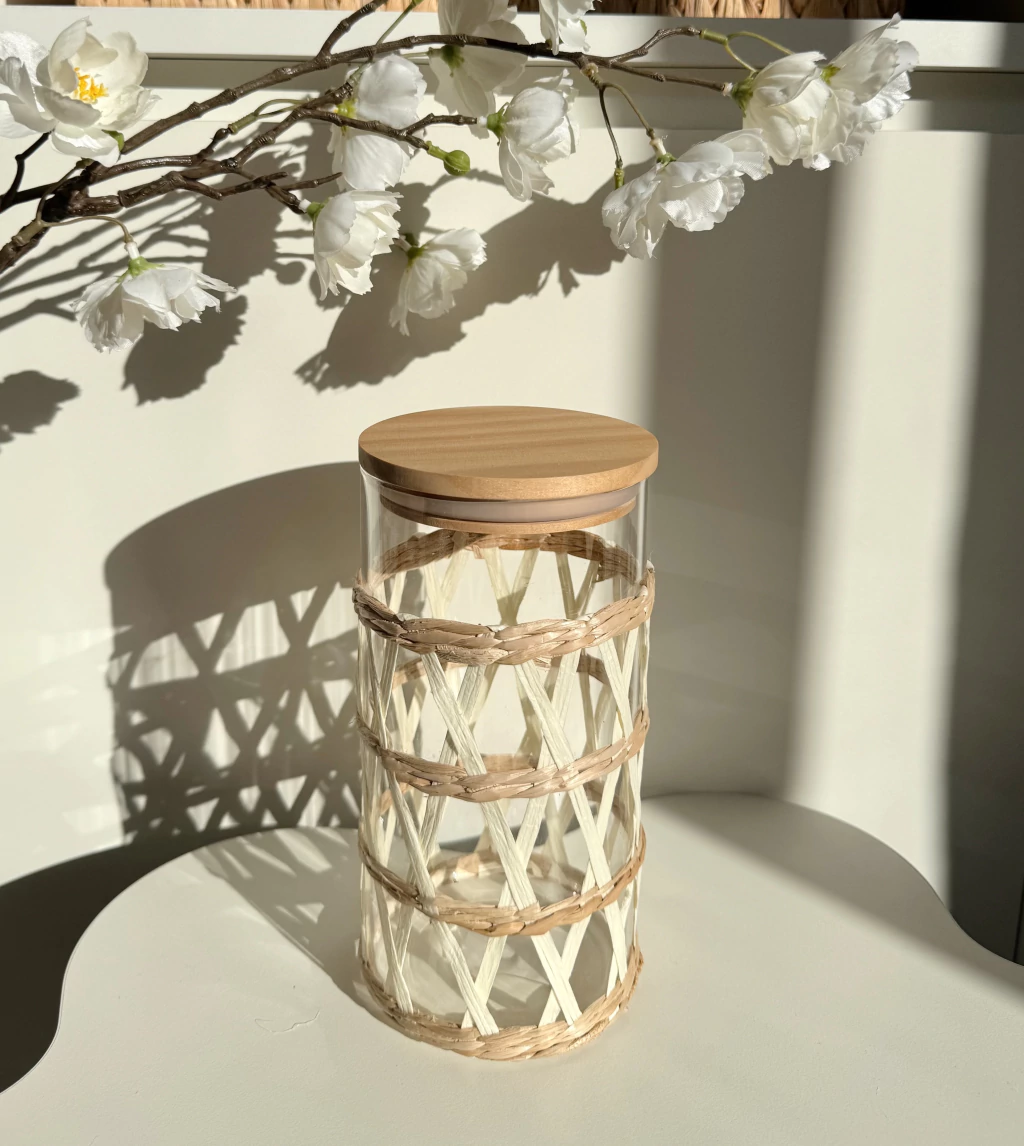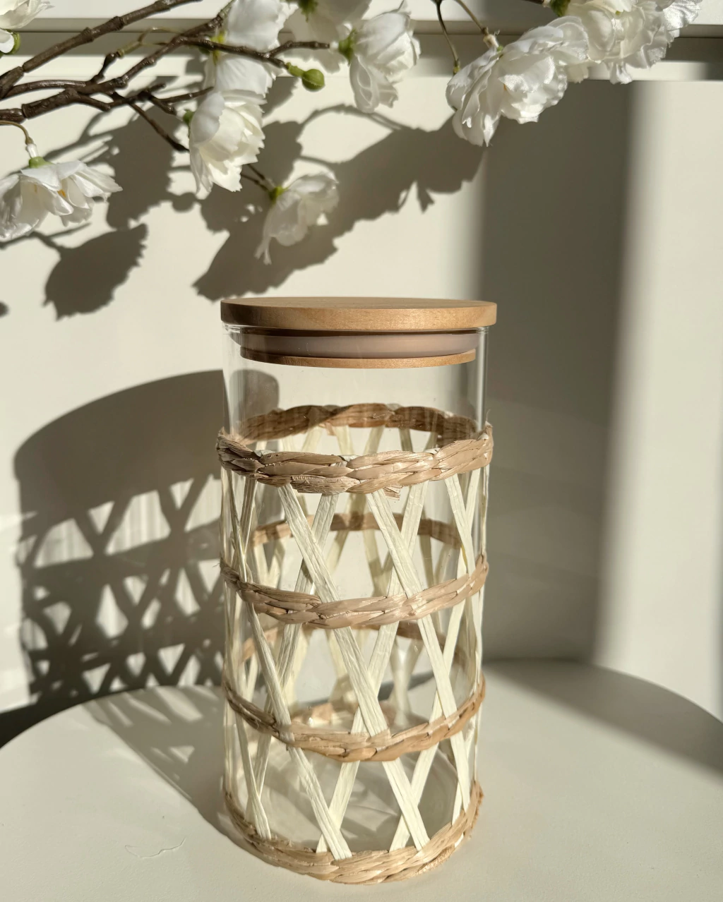 Organizá tu cocina o despensa con el Frasco India 1.2L. Fabricado en vidrio de alta calidad, cuenta con una tapa de madera y un elegante entrelazado de hoja de maíz. Sus medidas de 10x20,5 cm y capacidad de 1200ml lo hacen ideal para almacenar alimentos secos. De origen chino, es práctico, decorativo y fácil de limpiar.