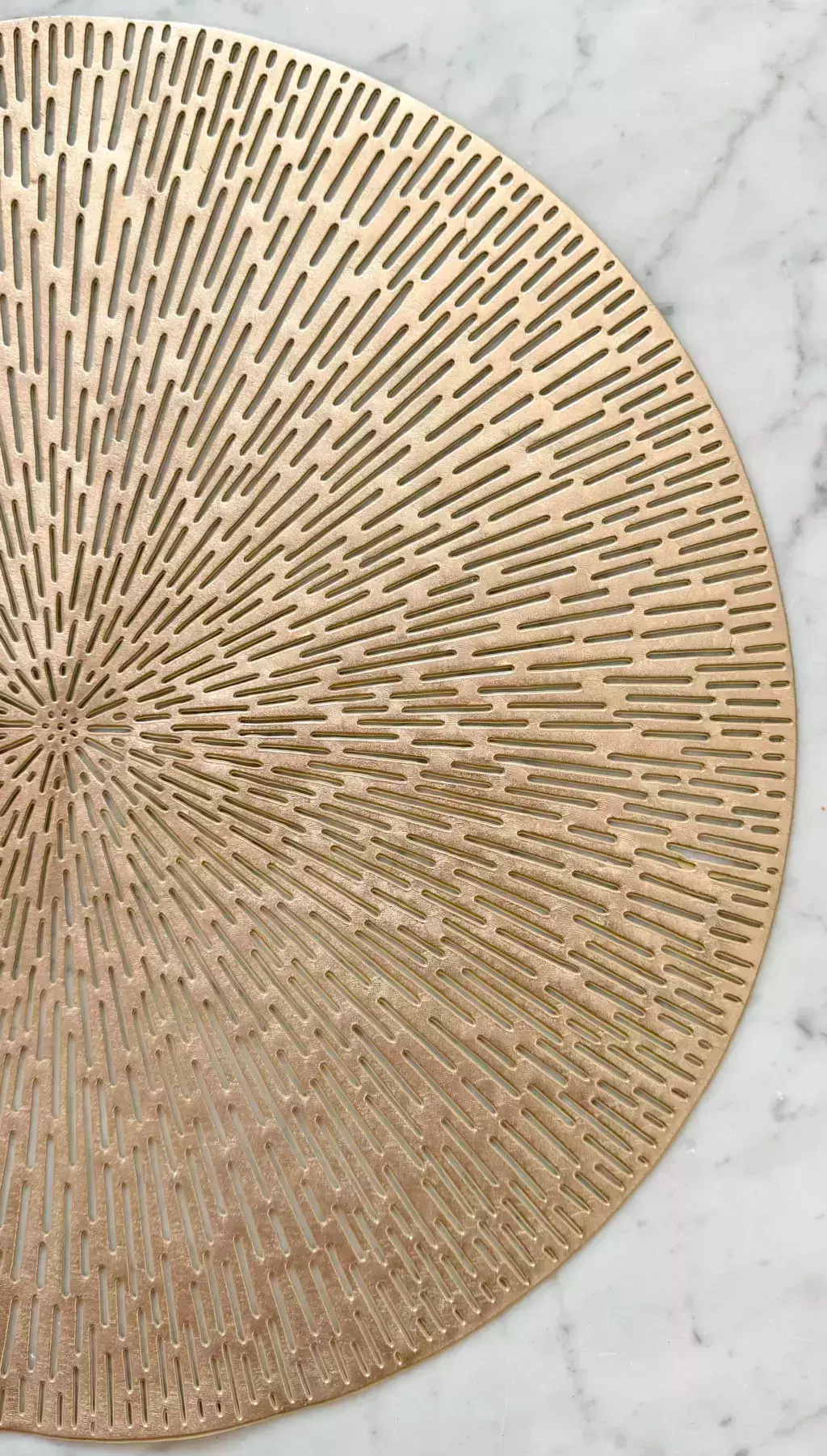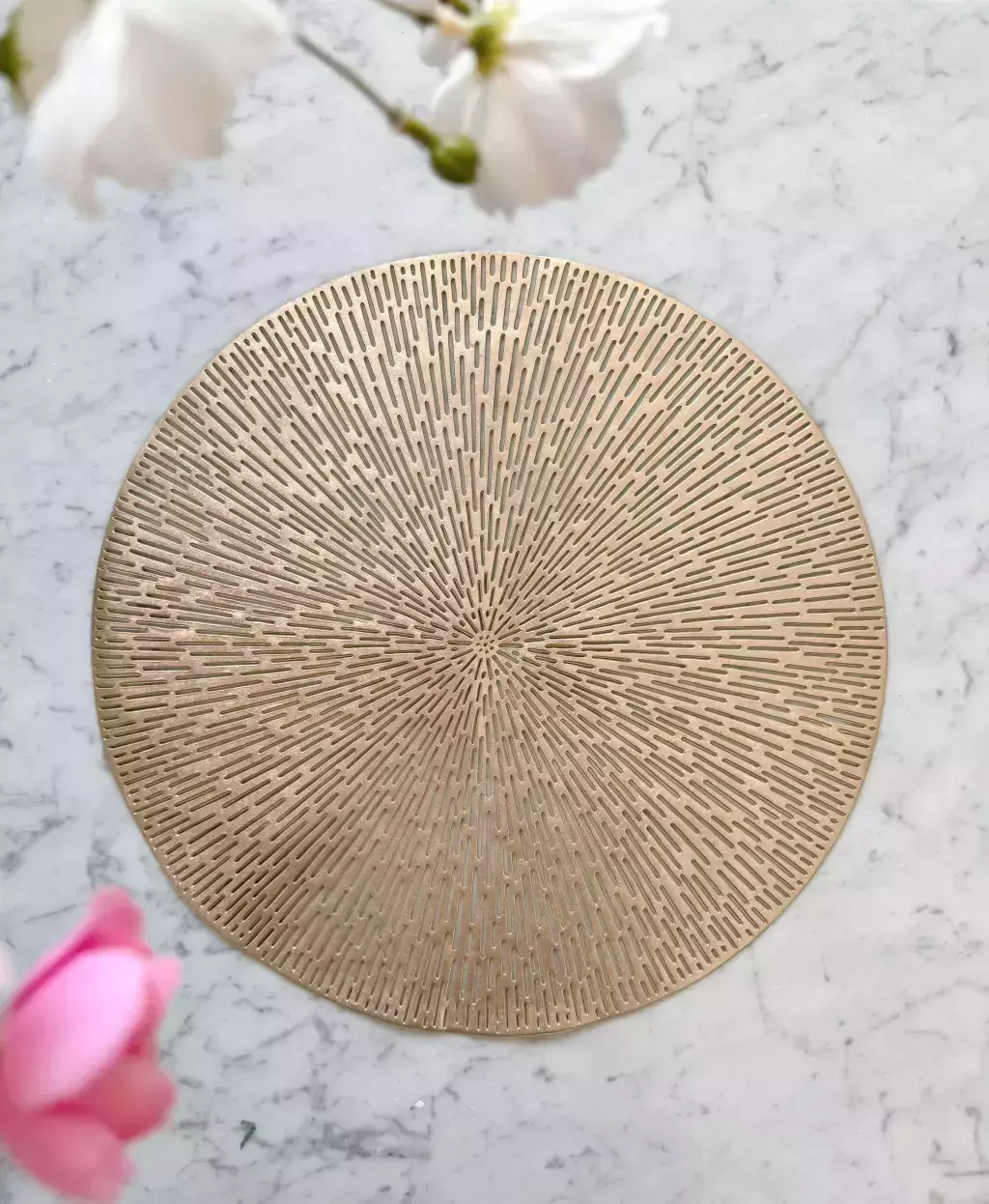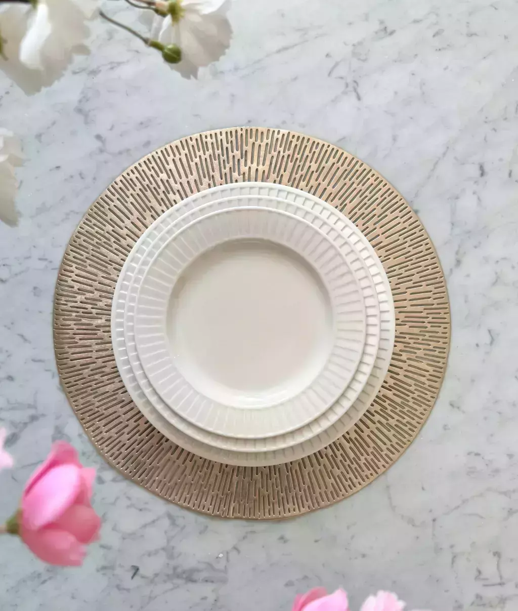 Agregá un toque elegante a tu mesa con el individual Callie Dorado. Fabricado en PVC, su diseño redondo calado con rayas doradas de 38 cm combina resistencia y estilo. Ideal para proteger superficies y realzar la decoración en reuniones o comidas diarias. Fácil de limpiar, es la opción perfecta para quienes buscan funcionalidad y distinción en cada detalle de su hogar.
