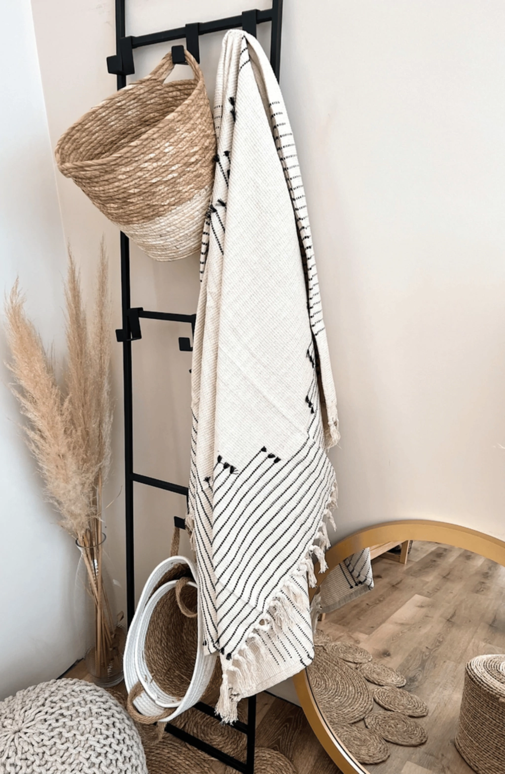 Agregá calidez y estilo a tus ambientes con la Manta Gia. Confeccionada en algodón tramado color blanco, presenta delicadas líneas de puntos en tonos oscuros y flecos naturales en los bordes. Sus medidas de 125 x 150 cm la hacen ideal para sofá, cama o sillón. Su diseño atemporal se adapta a cualquier decoración, ofreciendo suavidad y confort en cada uso.