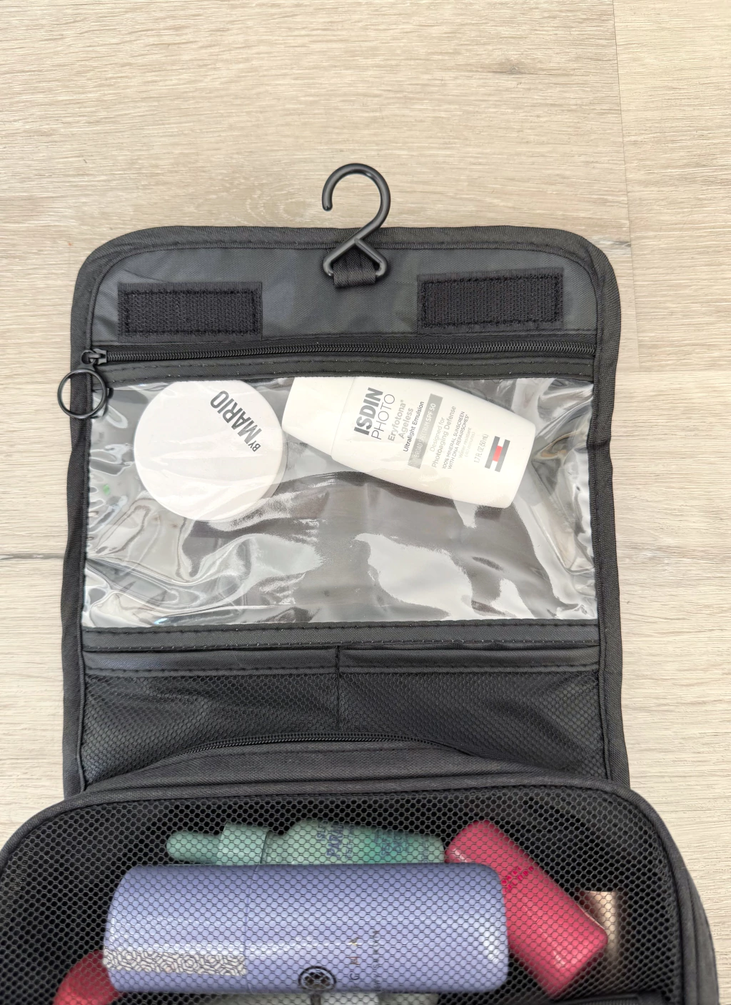 Neceser Edna Negro, un organizador colgante ideal para viajes. Fabricado en resistente tela, ofrece dimensiones de 41x23 cm, permitiendo guardar y ordenar tus artículos personales de manera eficiente. Su diseño práctico facilita el acceso y visualización de tus objetos. Perfecto para llevar cosméticos, productos de higiene o accesorios, es un aliado indispensable para mantener todo organizado durante tus desplazamientos.