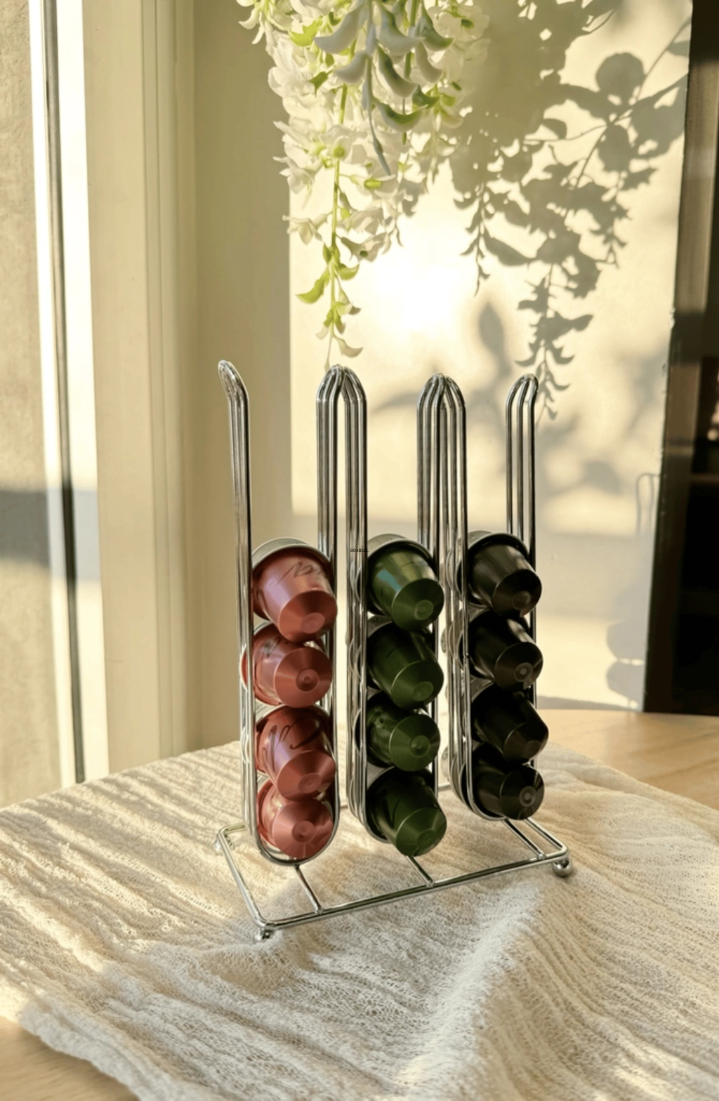 Porta cápsulas Hazelia para 42 cápsulas, ideal para organizar tus cápsulas de café tipo Nespresso. Su estructura cromada y base rectangular aseguran elegancia y estabilidad en cualquier espacio. Optimiza tu cocina o cafetería, manteniendo tus cápsulas siempre a mano y ordenadas. Diseño compacto y resistente, perfecto para quienes valoran la practicidad y el estilo en sus momentos de café.