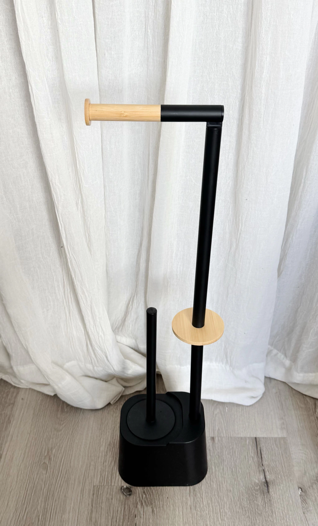Porta Papel Gael Negro, la solución elegante y funcional para tu baño. Con cuerpo de metal, tope de bambú natural y cepillo de goma acero con cerdas plásticas, combina diseño moderno y durabilidad. Medidas: 16,5 x 12,5 x 66,5 cm. Mantén tu baño ordenado y sofisticado con este accesorio práctico y resistente, ideal para complementar cualquier estilo de decoración.