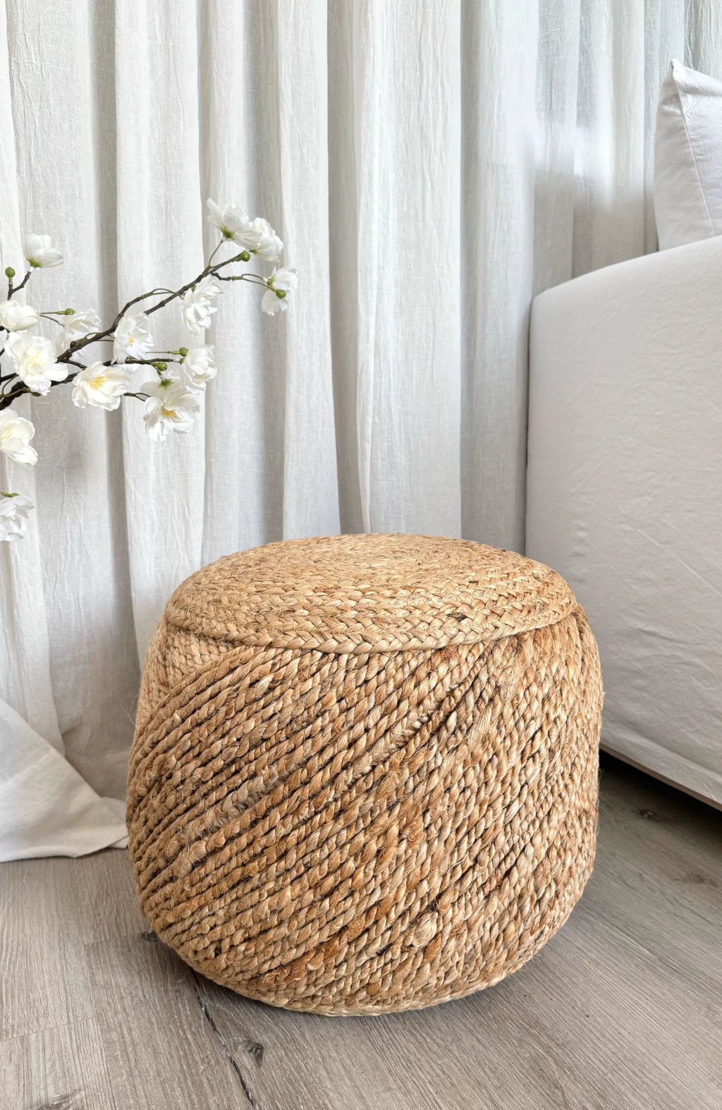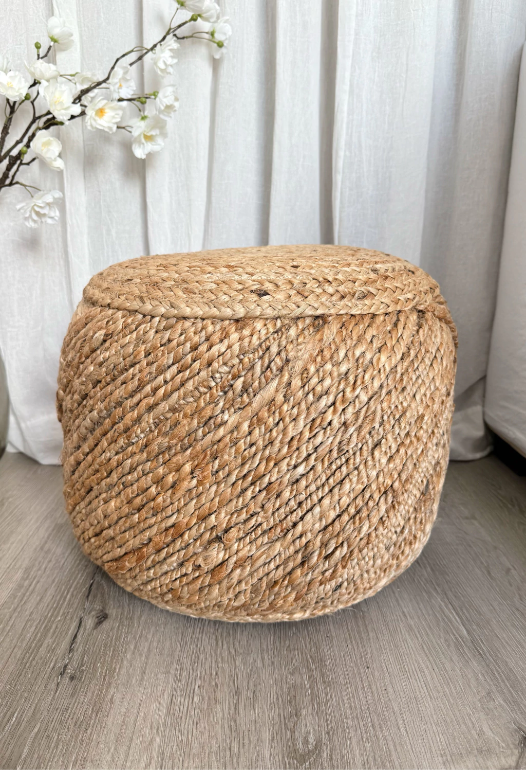 Puff Jabelle 40x30cm. Fabricado en India con 100% yute natural cruzado, este puff redondo es una opción ecológica y resistente. Sus medidas de 40x30cm lo hacen ideal como asiento auxiliar o apoyo decorativo. Aporta calidez y autenticidad a cualquier espacio, fusionando diseño y funcionalidad con materiales sostenibles y duraderos.