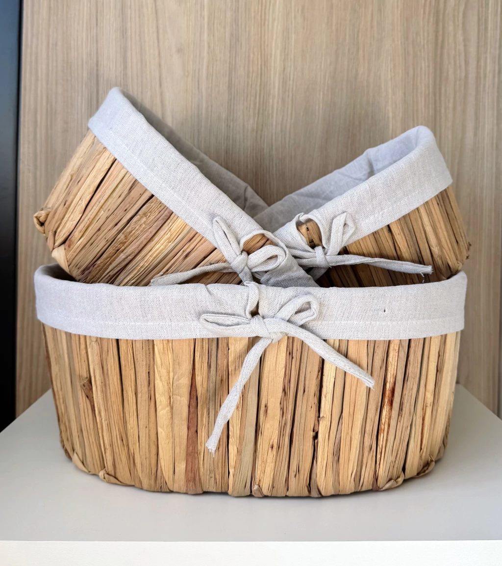 Set x3 Canastos Gozi, confeccionado en hoja natural y tela, ideal para organización y decoración de tu hogar. Incluye tres tamaños: 31x22x12 cm, 36x26x14 cm y 41x31x16 cm. Perfectos para almacenar ropa, juguetes o accesorios, aportando calidez y estilo natural a cualquier ambiente. Prácticos, versátiles y resistentes, combinan funcionalidad y diseño en cada espacio.