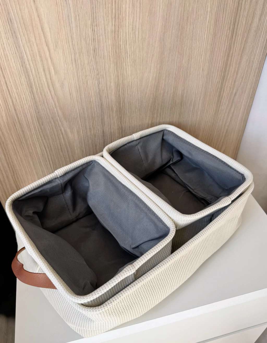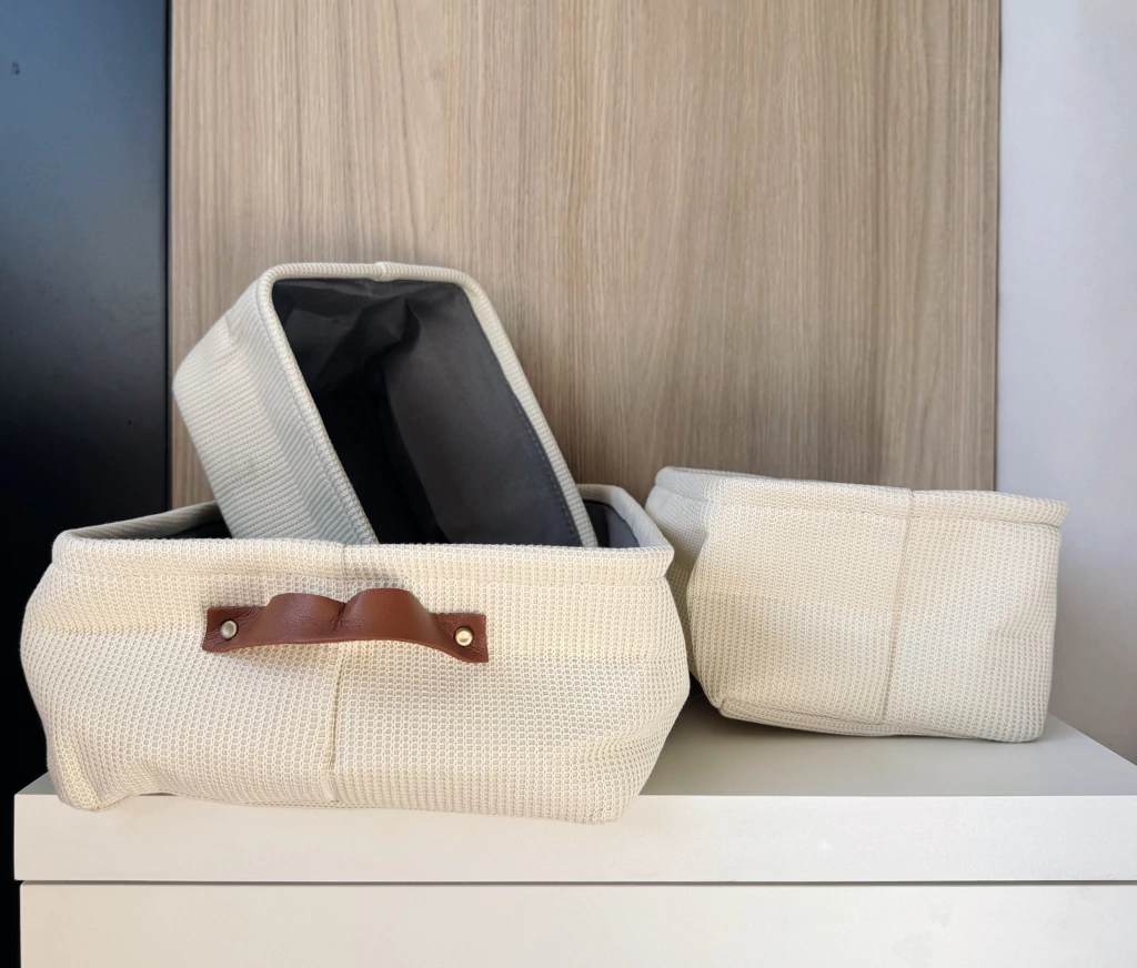 Set x3 Canastos Kalen Natural en color gris, diseñado para organizar tu hogar con estilo y practicidad. El set incluye un canasto grande con asa color marrón (36x26x12 cm) y dos chicos (23x18x12 cm). Ideales para guardar ropa, juguetes o accesorios, estos canastos de tela aportan un toque moderno y funcional a cualquier ambiente.