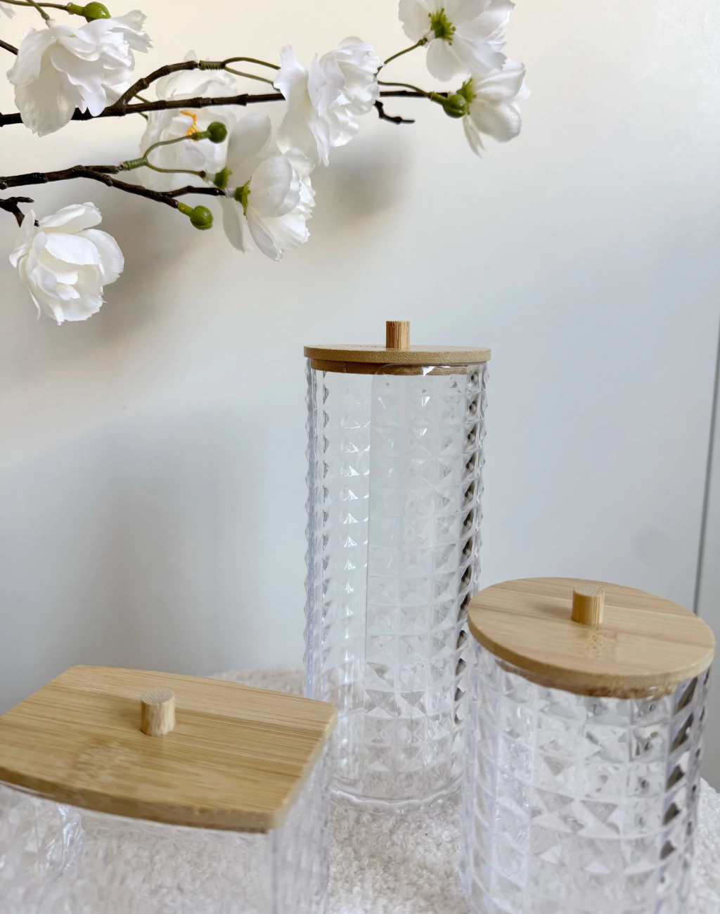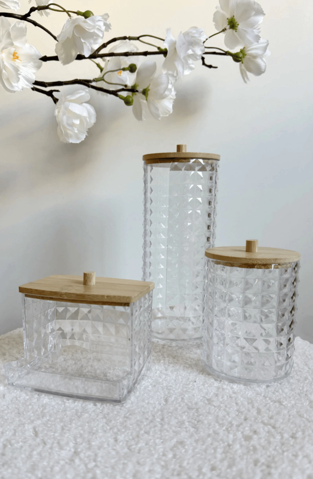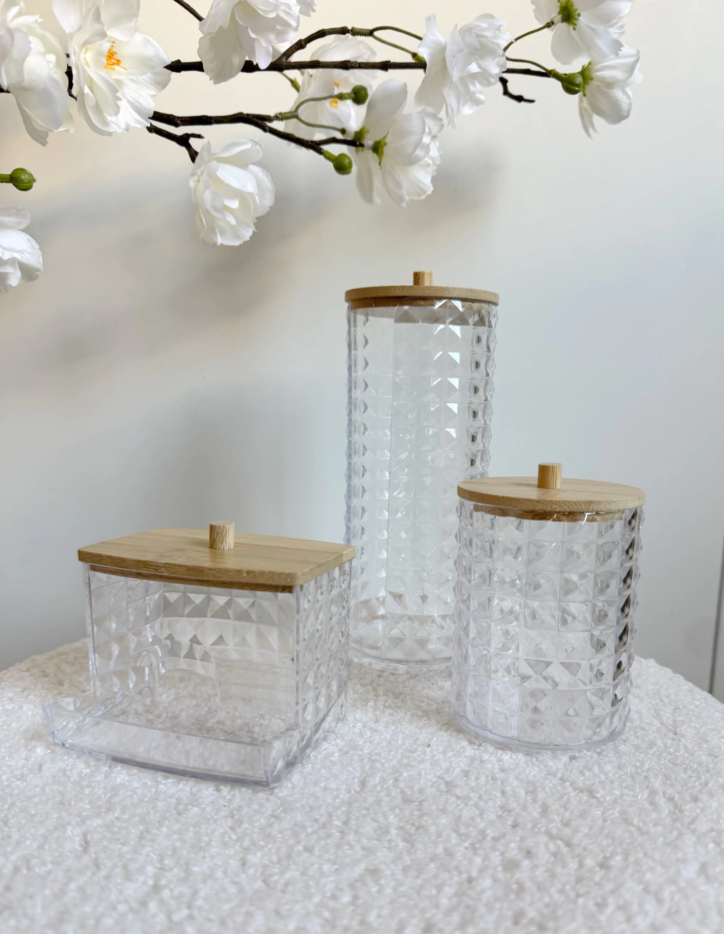 Set x3 piezas para maquillaje Juanita, ideal para mantener tu espacio organizado y elegante. Incluye dos porta toallas (grande de 17x7cm y chico de 9,5x7cm) y un porta hisopos (9x6,5cm), todos fabricados en plástico con diseño de cuadros y tapa de bamboo. Perfectos para tu tocador o baño, combinan practicidad y estilo, ayudando a conservar tus accesorios de belleza siempre a mano y protegidos.