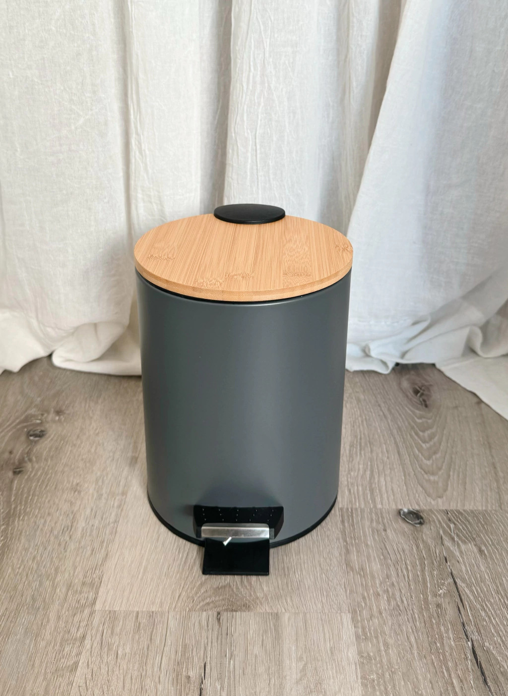 Optimizá la higiene y el diseño de tu baño con el Tacho Aina Negro. Su formato compacto de 17 cm de ancho x 22,5 cm de alto y capacidad de 3 litros lo hace ideal para espacios reducidos. Incluye tapa de bamboo, pedal con freno y estructura metálica, combinando funcionalidad, elegancia y durabilidad. Perfecto para baños modernos y organizados.