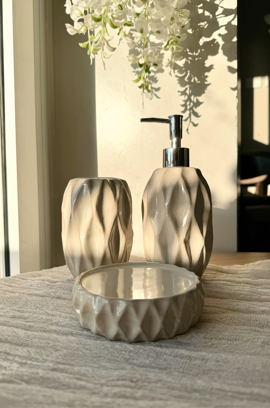 Descubrí el Porta cepillo de cerámica labrado con diseño de rombos en color natural y detalles beige, ideal para sumar elegancia a tu baño. Sus medidas son 8 cm de ancho x 12,5 cm de alto, lo que lo hace práctico y decorativo. Fabricado en China, combina calidad y estilo, aportando un toque sofisticado y funcional a tu espacio personal.